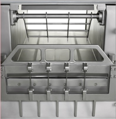 TBG taie calupul de carne congelata cu o lama de tip ghilotina operat de un sistem hidraulic extrem de puternic. Mașina standard, este echipata cu 1 lama orizontala si 4 lame verticale, produsul rezultat este de 4 cm grosime si 10/12 cm latime.
